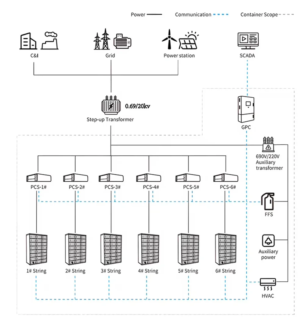 Containerized Battery Energy Storage System ESS is a high integrated solar generation and battery storage system. The energy storage system includes battery,inverter, PCS, thermal management, fire suppression, and smart controller.